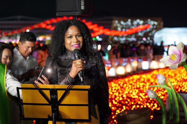 ▲貝里斯駐台大使碧坎蒂(Dr. Candice Pitts)介紹花燈意象,並提及貝里斯當地擁有多元文化和多樣生態系,深受全球旅客喜愛。(圖/中美洲經貿辦事處提供)