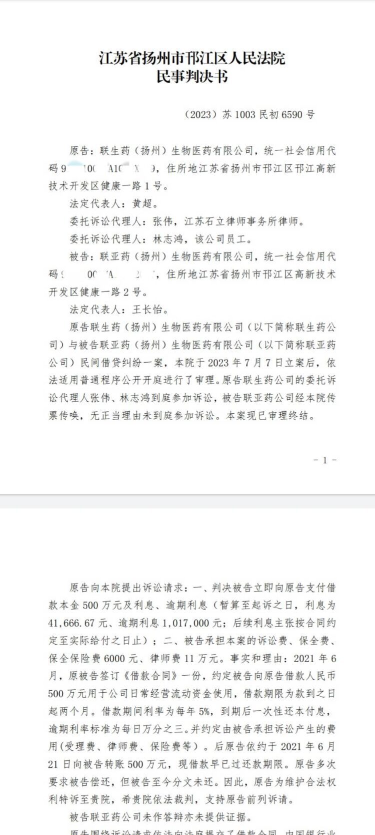 根據中國江蘇省揚州市邗江區人民法院判決書所載,王長怡以聯亞藥(揚州)生物醫藥有限公司負責人於2021年6月份向聯生藥(揚州)生物醫藥有限公司簽訂《借款合同》,約定借款人民幣500萬元用於公司日常經營流動資金使用,借款期限為款項入帳起兩個月。借款期間利率為每年5%,到期後一次性還本付息,逾期利率標準為每日萬分之三,並約定由被告承擔訴訟產生的費用(受理費、律師費、保險費等)。