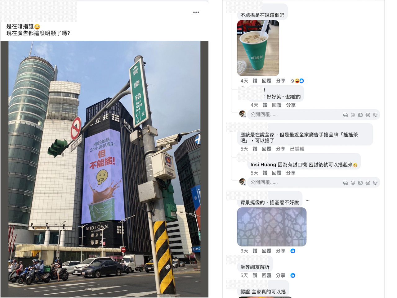 事實上提到手搖飲,身為「手搖飲大國」的子民,之前就曾有網友討論怎樣才有資格可以叫做「手搖飲」?有網友直白點出「現點現做就是王道」、「一定要用杯裝方便好攜帶」,不過說到最後終於有網友點出最大關鍵,那就是——要有封膜!「沒錯!只用塑膠蓋的我一律通稱『普通飲料』」、「現在竟然還有沒封口的手搖飲嗎!?」、「喝之前可以倒過來上下左右搖最爽了!」因為西門町的戶外廣告,看熱鬧的網友聚集到FB路觀社團紛紛坐等網友解析『是誰不能搖?』網友紛紛給出精闢的個人見解,也對全家難得的超狂言論表示「好好笑⋯超嗆的」、「我最喜歡血流成河了!」