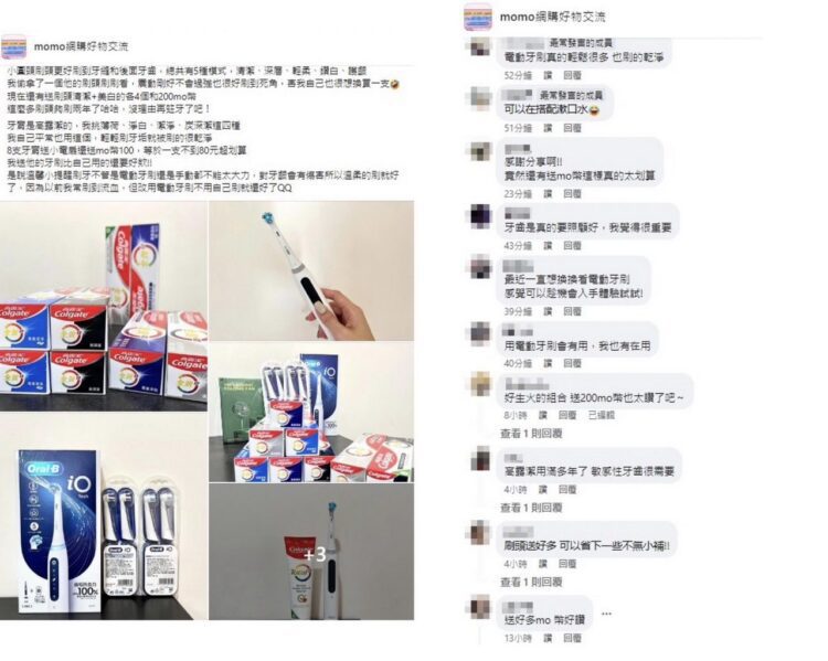 牙線、牙膏加上電動牙刷雙管齊下,再配合正確刷牙方法,才能確實維護牙齒健康,網友也提醒刷牙千萬不要太大力,否則會傷害到牙齦,也力勸大家真的要好好照顧牙齒健康,否則年紀輕輕就得花大筆錢植牙或做假牙。此外,網友們也特別討論到其實在電商平台購物,不但能夠在家輕鬆比價,而且趁著優惠檔期購物還能享有更多好康回饋。購物前不妨先上電商平台搜尋或是可以到「momo網購好物交流」這類型的購物資訊討論臉書社團先參考其他消費者分享的好康優惠再下單,享受聰明購物、花錢買快樂的感覺。
