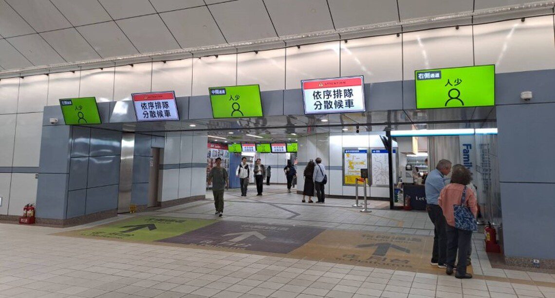國父紀念館出口5連通道,設有人流顯示面板,旅客從連通道進入車站後,可即時透過螢幕了解車站人潮狀況;此外,該顯示面板將進出站動線分為3大區塊,根據通過的人數顯示燈號,綠色為人潮較少、黃色稍多、紅色則是人潮擁擠,旅客可依燈號顯示選擇不同動線至相對應的車廂分流、分散候車,乘車更輕鬆。